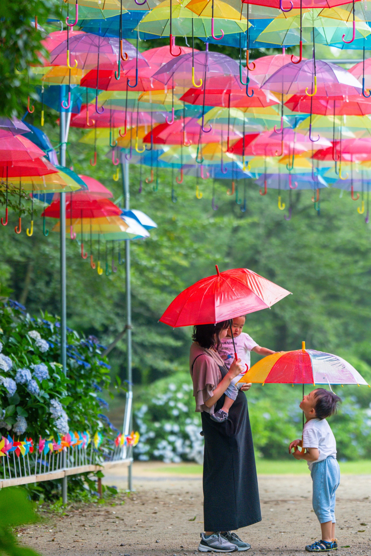 梅雨空の下、紫陽花が静かに咲く道端で、家族の笑い声がやさしく響いていました。