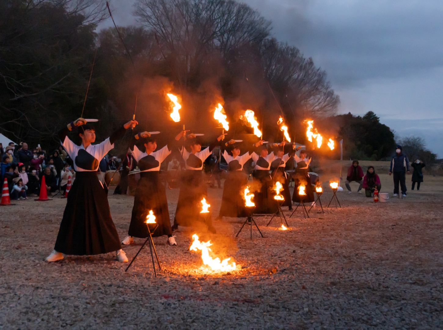 黒羽中の弓道部の皆さんが弓矢でどんど焼き開始です。